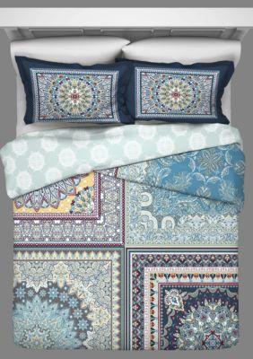 This bedding set embodies boho style with its layers of different patterns in rich reds, blues, and golds.